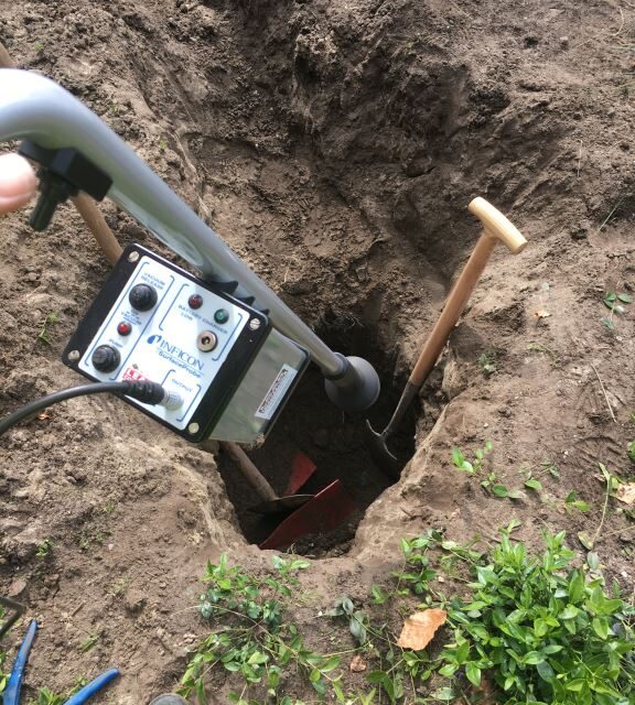 Terreinleiding is in de ochtend leeg gemaakt en daarna gevuld met Formeergas tot z’n 5 bar. 3 uur later heeft Leak Control Benelux met de speciale Inficon H2 lekdetectie apparatuur (Inficon 9012 xrs met grondprobe 8612 en sleepmat) binnen 30min het lek gevonden. De leiding lag ca 1,2m diep. Uiteindelijk was een (werk) gat graven van 3×2 meter voldoende.